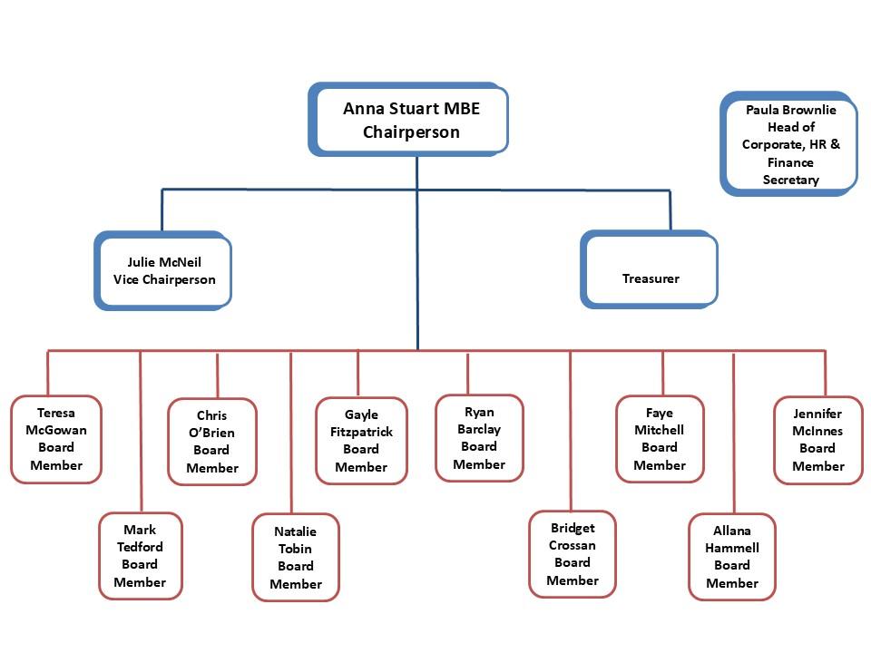 Chairperon - Anna Stuart MBE Vice Chairperson - Julie McNeil Treasurer - Gayle Fitzpatrick Board Member - Teresa McGowan Board Member - Mark Tedford Board Member - Faye Mitchell